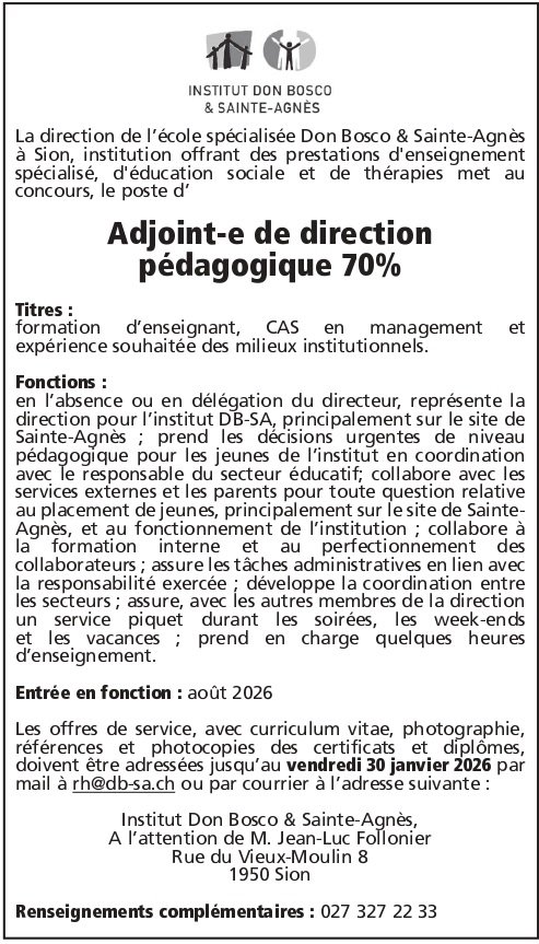 L’institut Don Bosco & Sainte-Agnès offre des postes dans les domaines de l’enseignement, de l’éducation, de la pédagothérapie, de l’administration, de l’intendance ou de la cuisine.